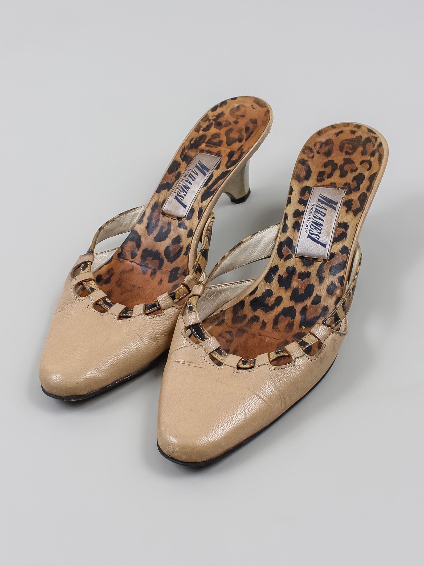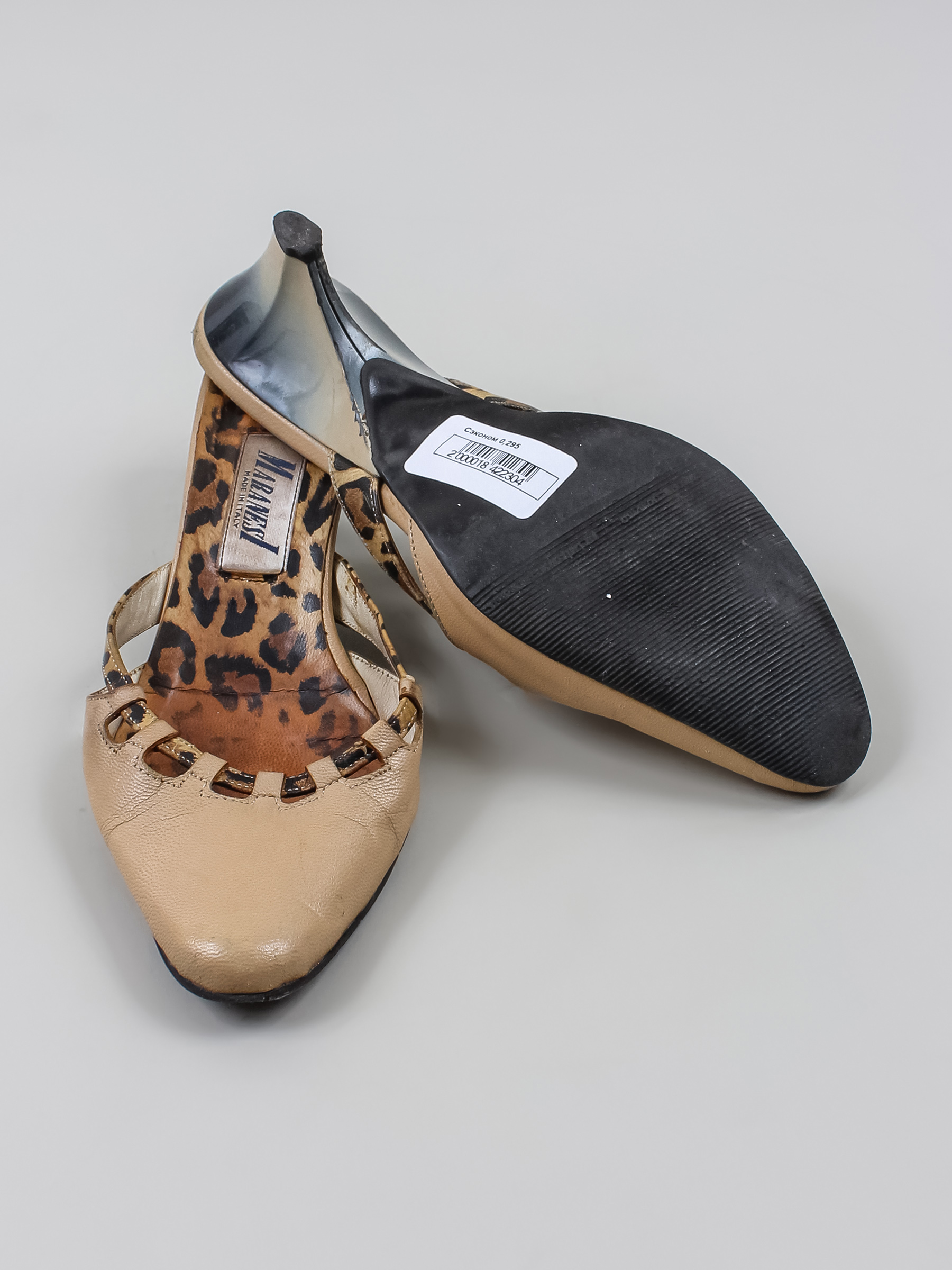 Маркировка на изделии отсутствует. Размер указан на основании замеров. Есть загрязнения, заломы, царапины, потертости, повреждения, износ подошвы.