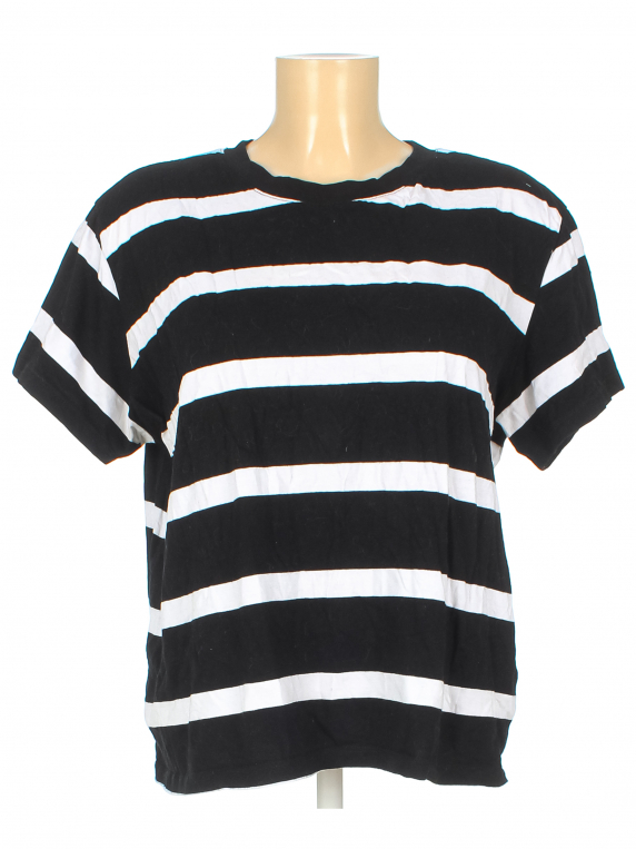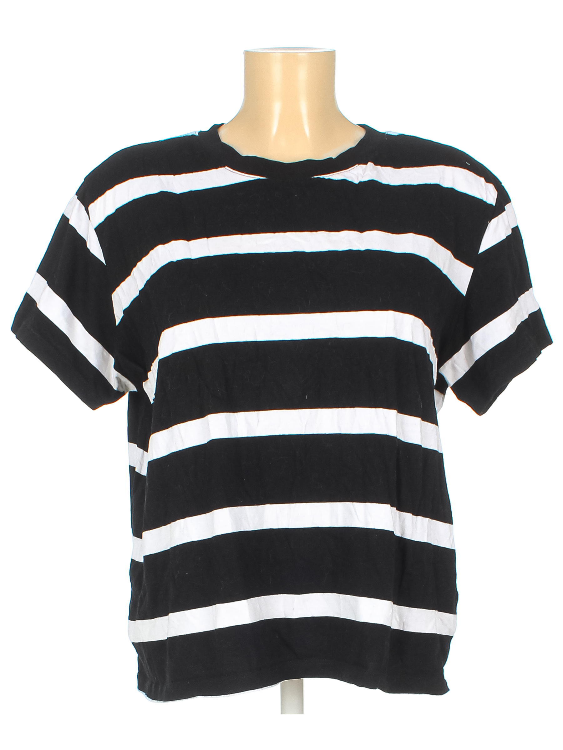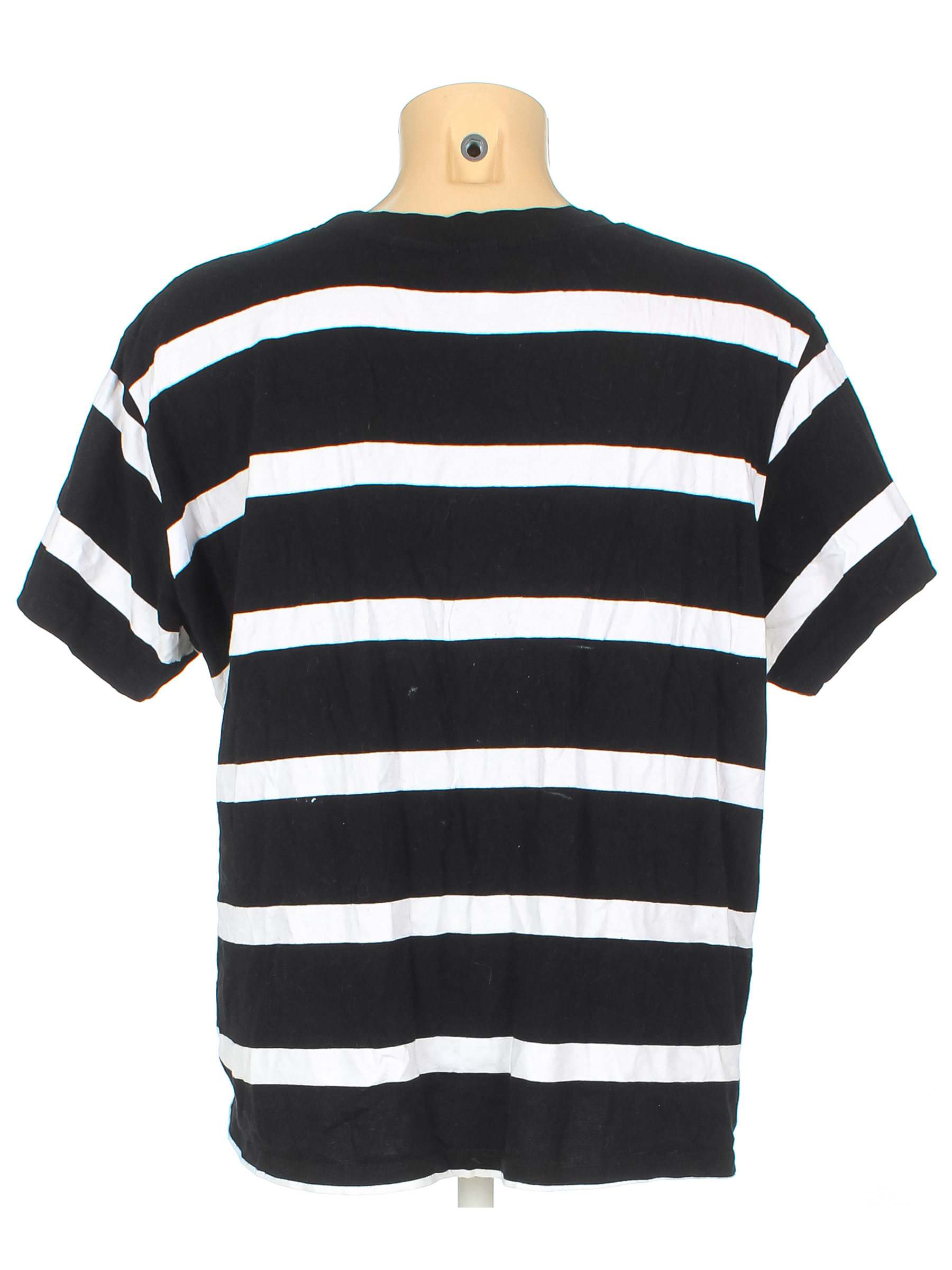 Есть катышки, загрязнения, в том числе в области подмышек, ткань немного потускнела, есть перекос.