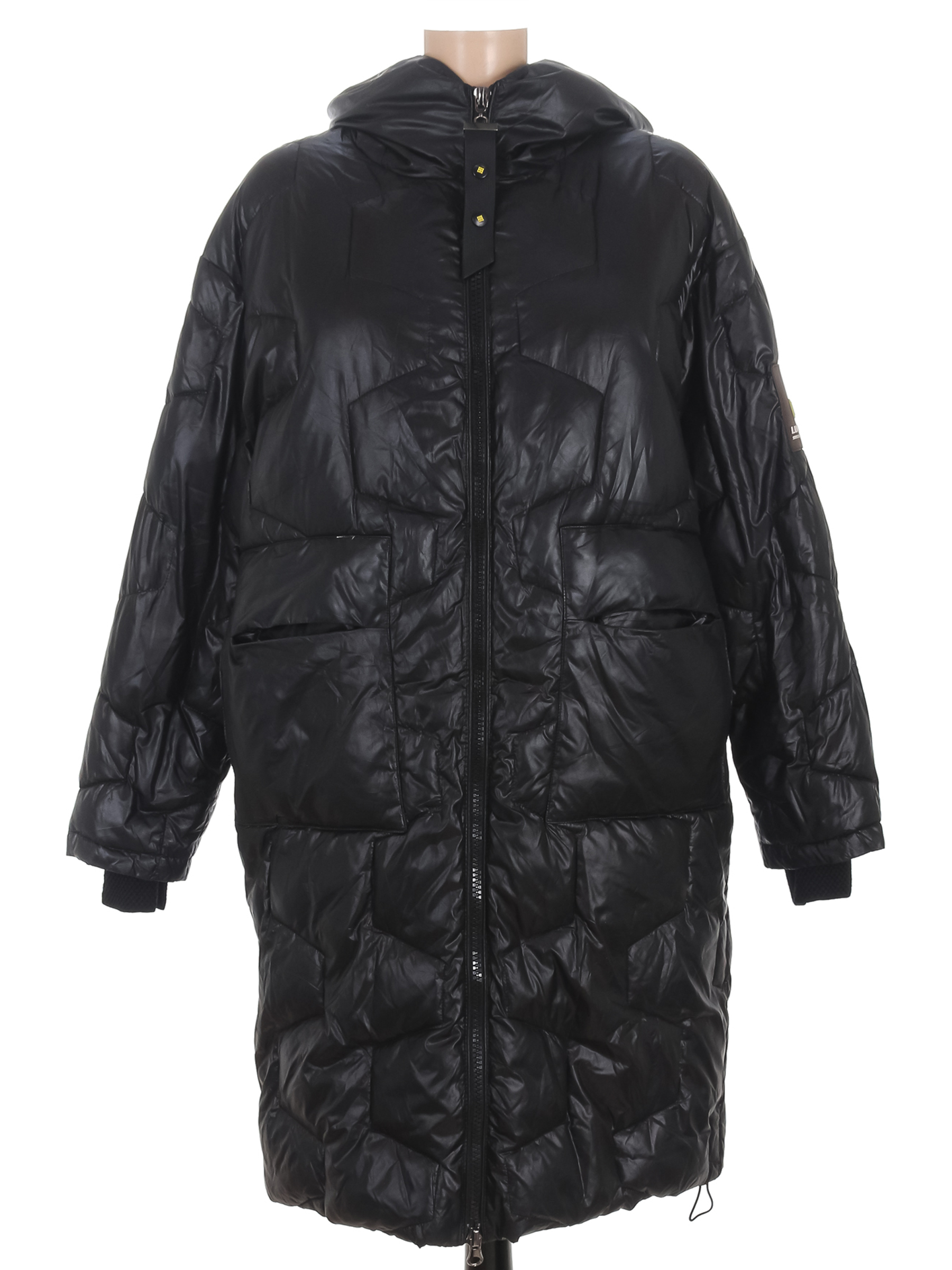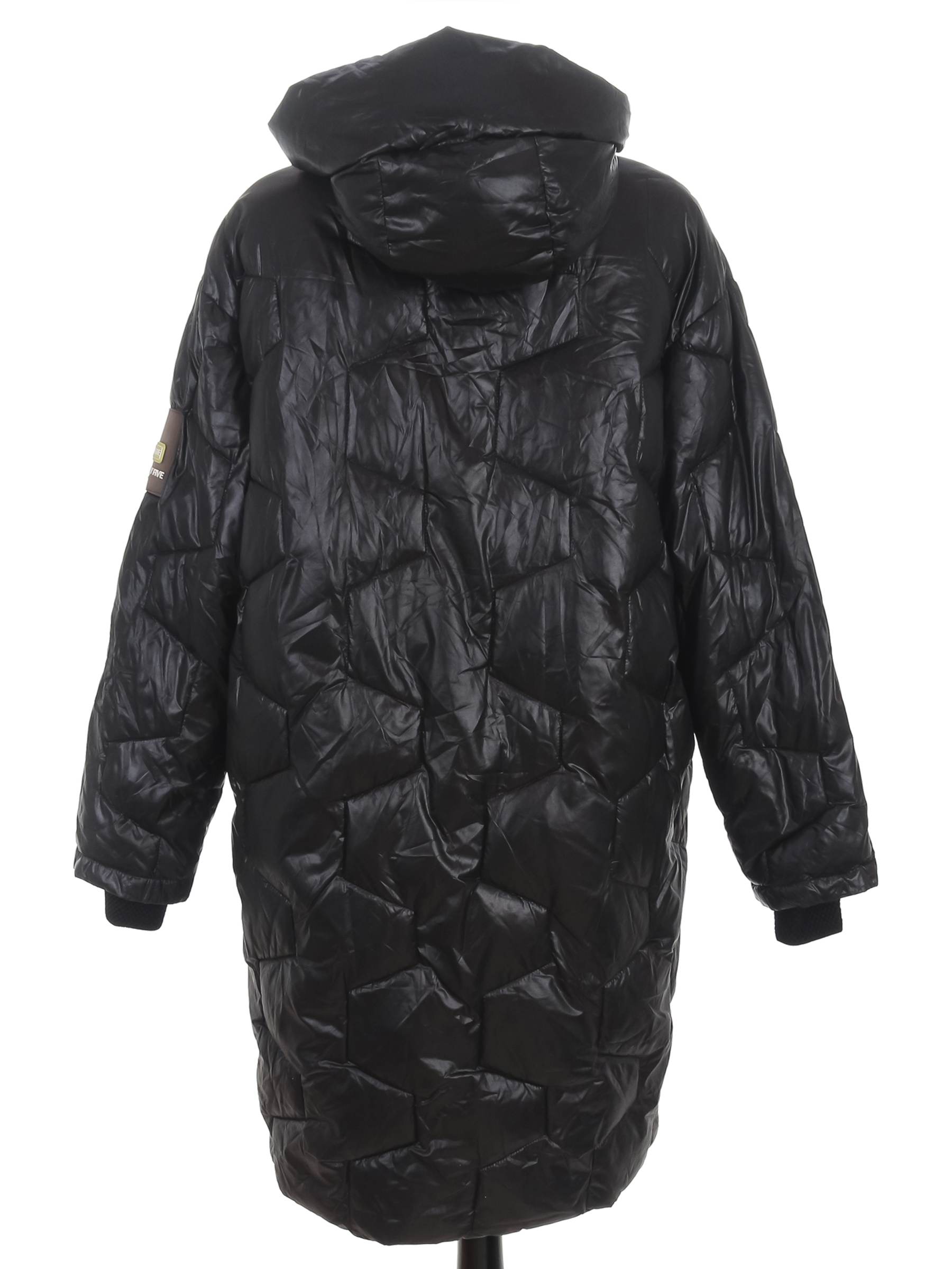 Есть загрязнения, местами сбился наполнитель, на манжетах катышки. Замер рукава указан от горловины.
