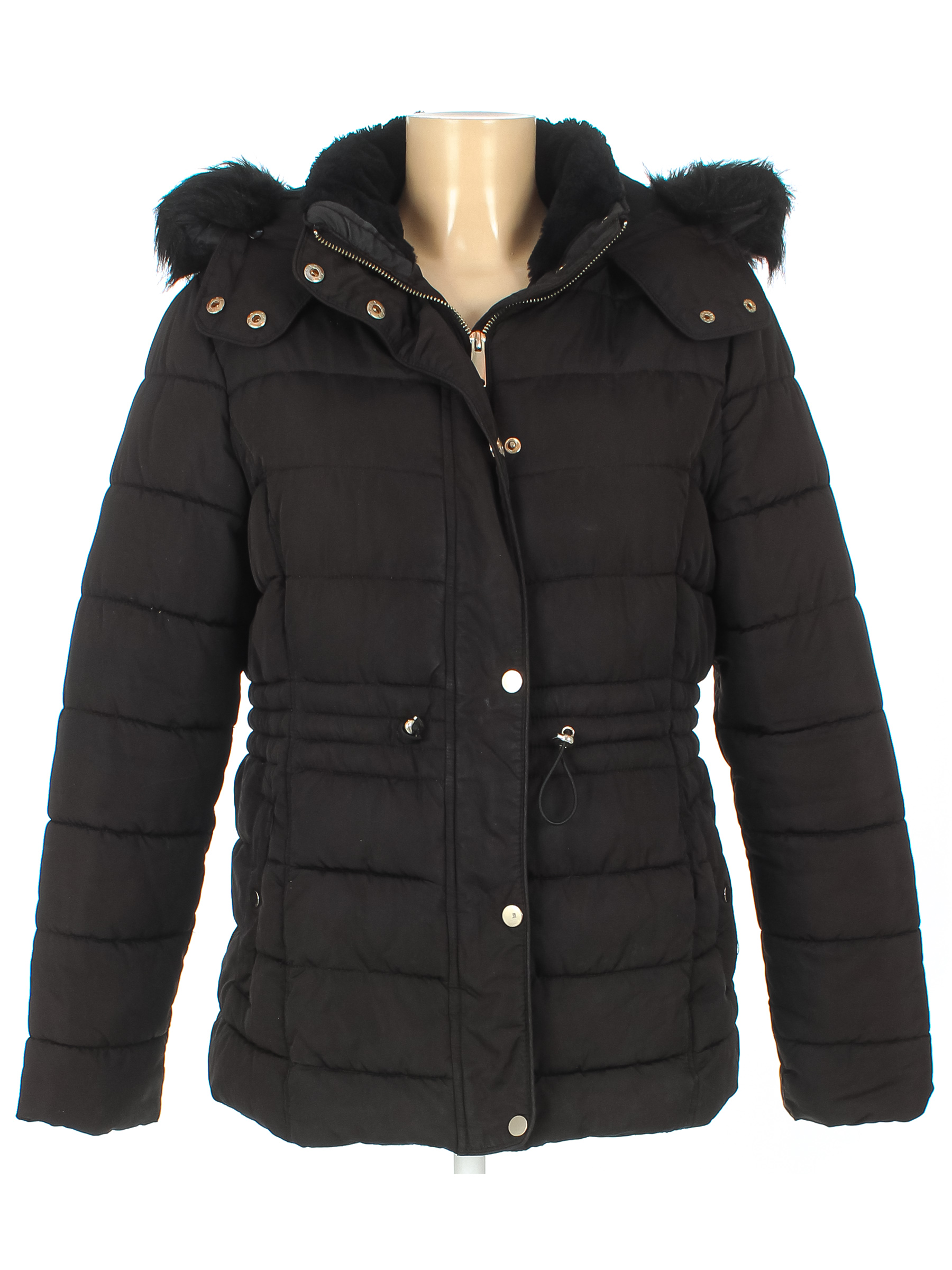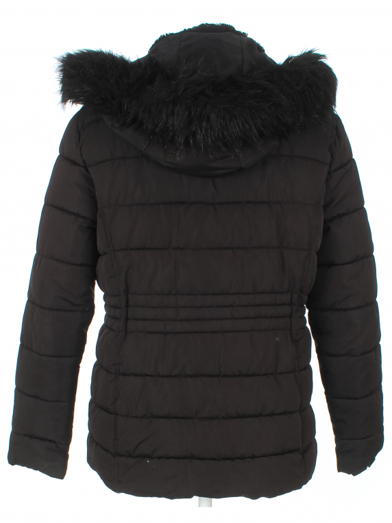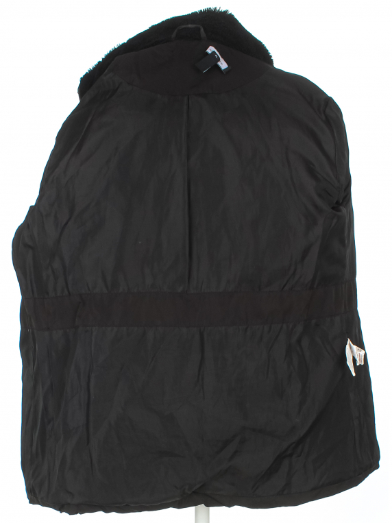 Наполнитель местами сбился. На подкладке вытянута ткань по швам. Мех скатался. Ткань местами лоснится. С лицевой стороны распускаются строчки. Есть потертости и повреждение материала на рукаве.