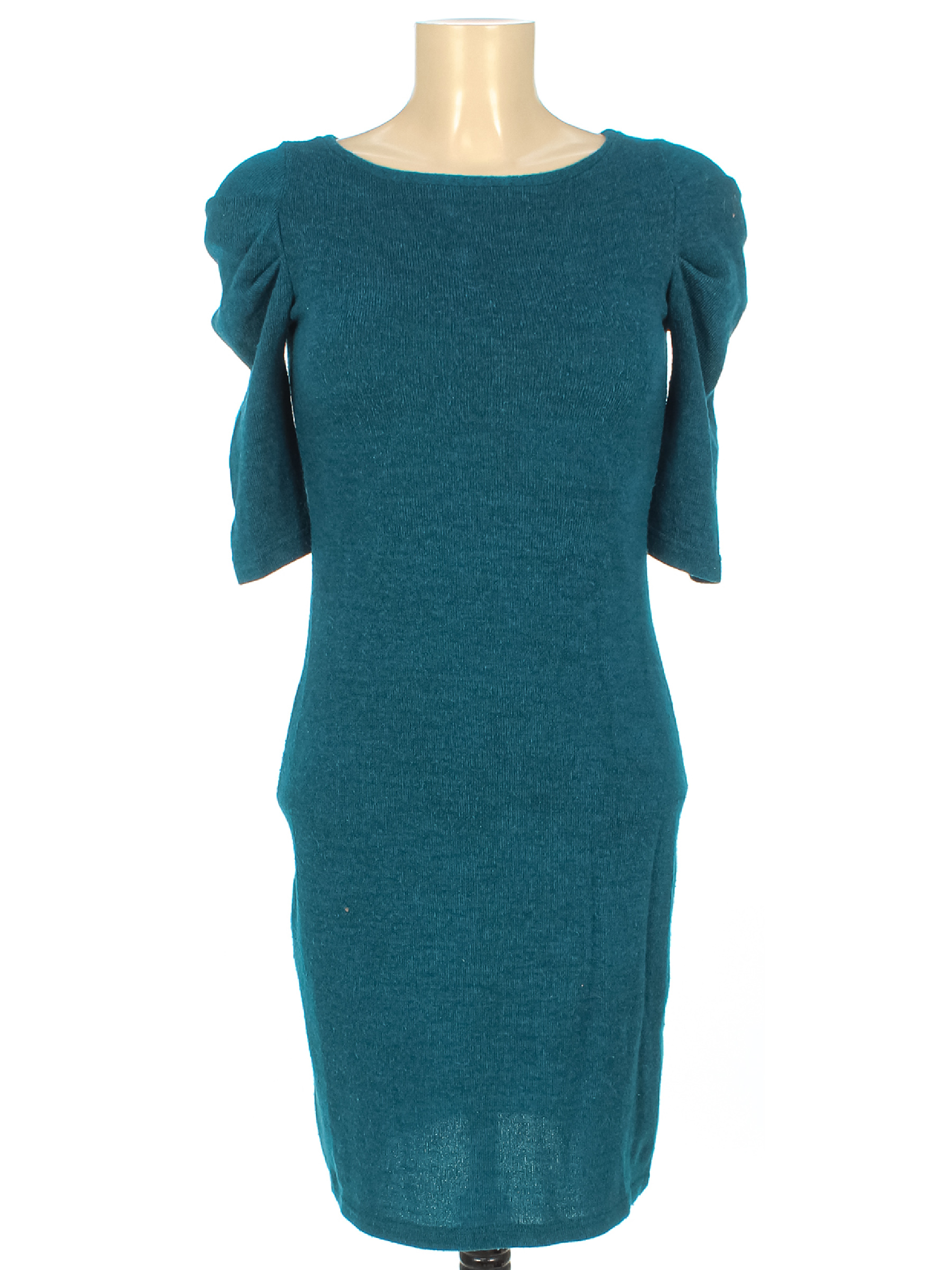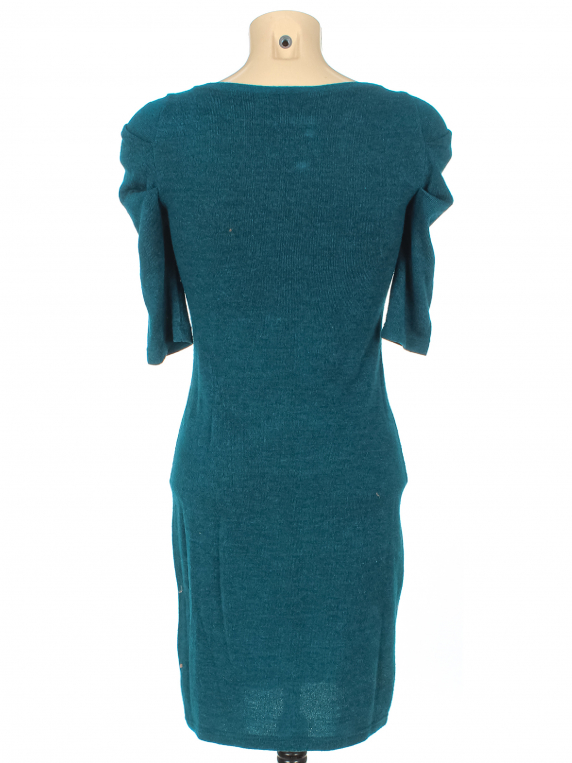 Маркировка на изделии отсутствует. Размер указан на основании замеров 38-40. Сине-зеленый. Есть катышки, лоснящиеся пятнышки, ткань местами немного вытянулась.