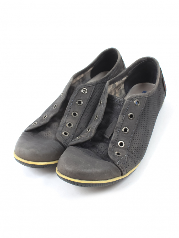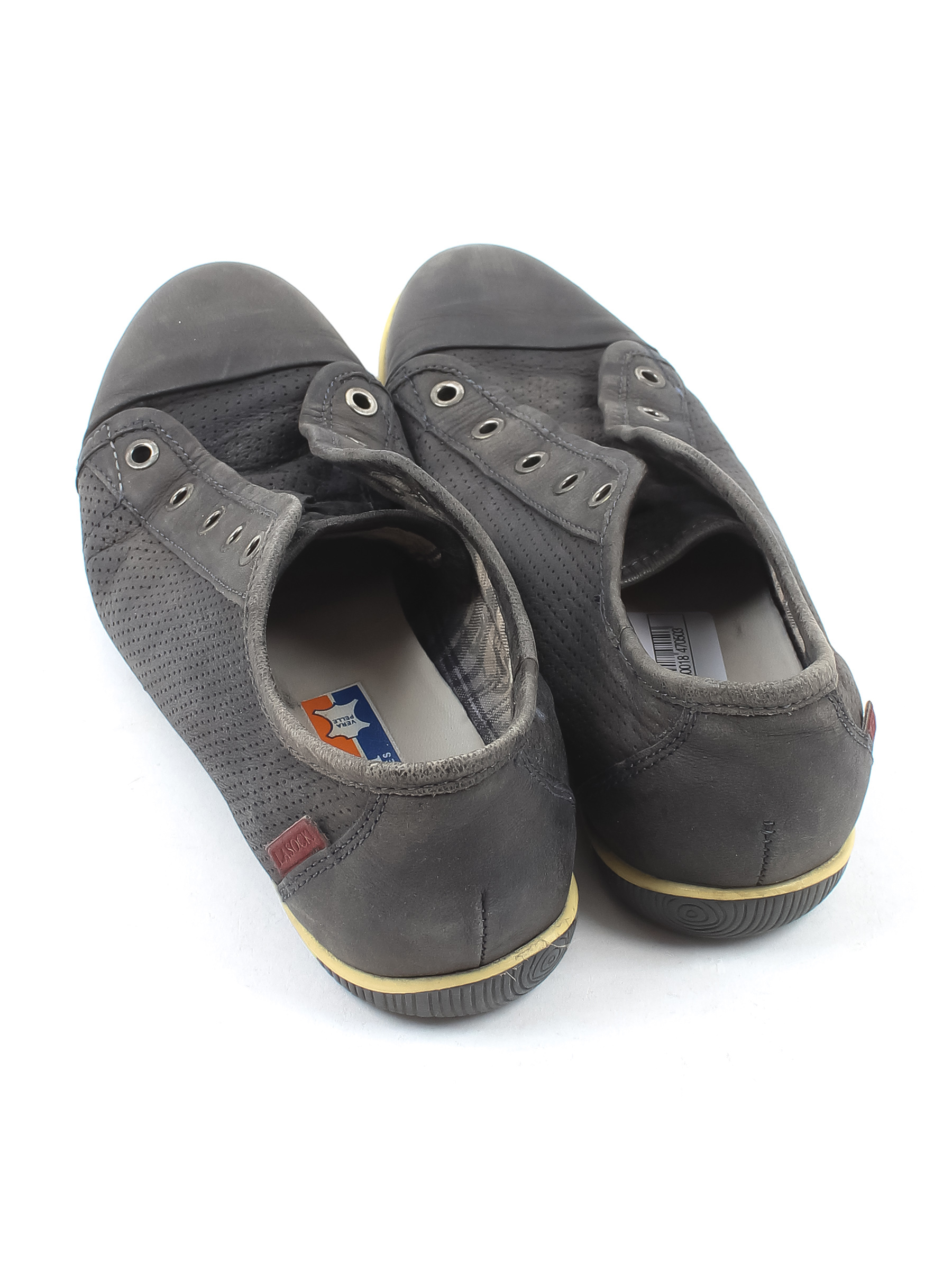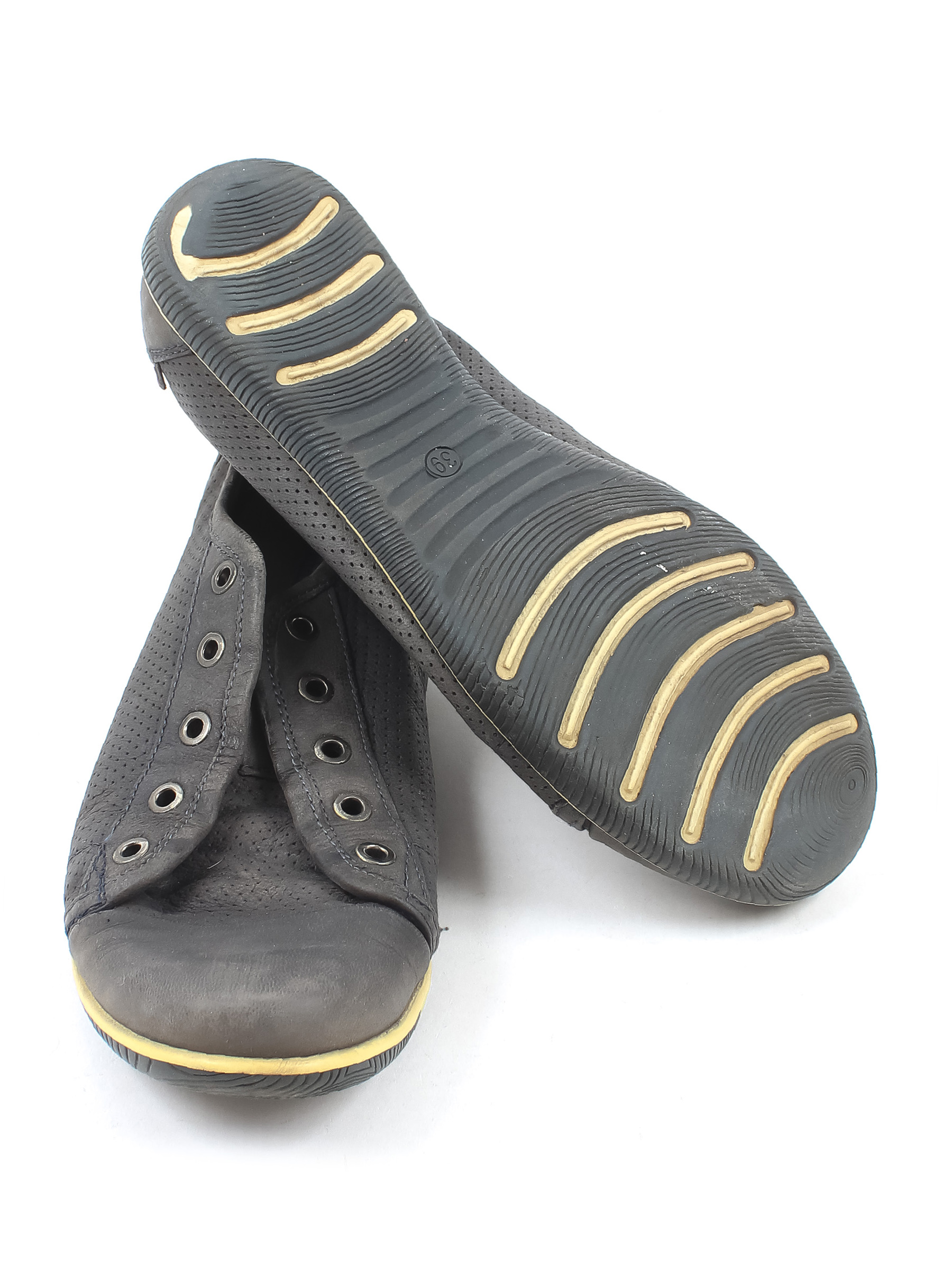 Есть износ подошвы. Потускнел цвет ткани. Есть замятия и загрязнения. Нет шнурков. На изделии есть знак кожа.