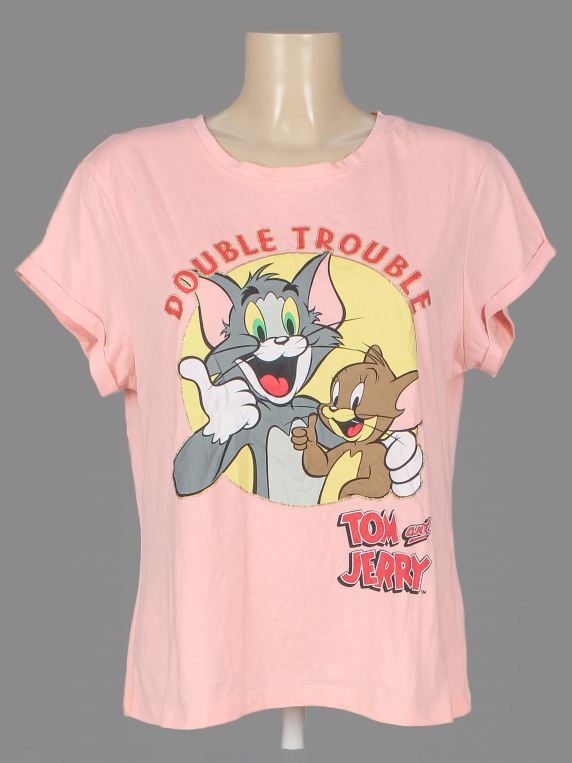 Есть мелкие пятнышки (возможно отстирается), катышки. Потрескалась краска на принте.