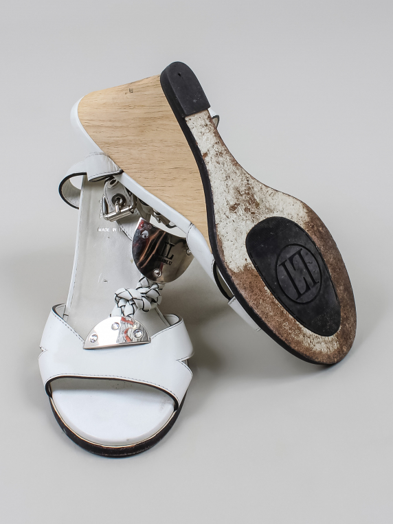 Маркировка на изделии отсутствует. Размер указан на основании замеров. Есть загрязнения, износ подошвы, потертости/повреждения материала.
