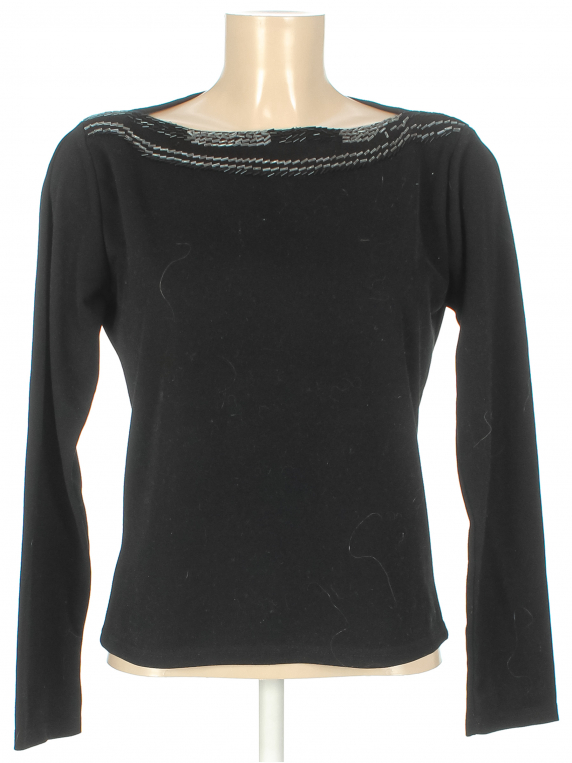 Маркировка на изделии отсутствует. Размер указан на основании замеров 44-46. Есть катышки, затяжки, загрязнения, ткань потускнела, лоснится, нет нескольких элементов декора (бисера) - распускается нить.